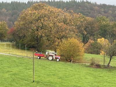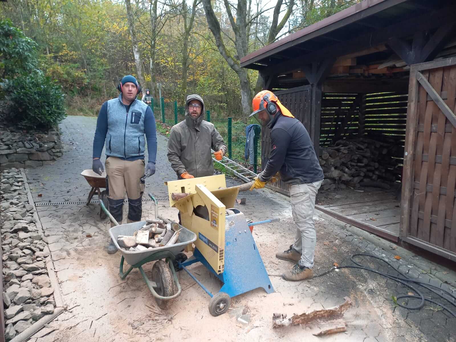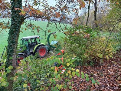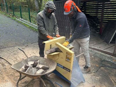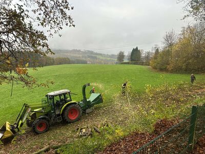 An diesem Samstag Vormittag haben wir mit schwerem Gerät ein paar alte Bäume in unserer Böschung gefällt, gesägt und gehäckselt. Bereits eingelagertes Holz wurde passend gesägt und in unserem Holzkeller eingelagert