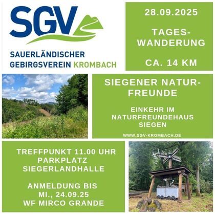 Am Samstag den 16.09.2023 werden wir eine Tageswanderung (ca. 20 km) ab unserem Wanderheim führen und anschließend einkehren. Treffpunkt bei der SGV-Hütte ist um 10:00 Uhr.