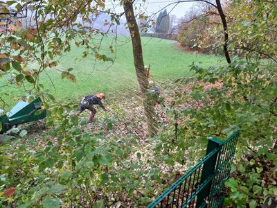 Parallel zu den Baumfällarbeiten wurde die Außenanlage der Hütte auf den bevorstehenden Winter vorbereitet. Wir haben ein letztes Mal gemäht und Etliches an Laub entfernt. Gemäht wurde auch am Spielplatz des Kindelsbergs und an der Porr-Hütte.